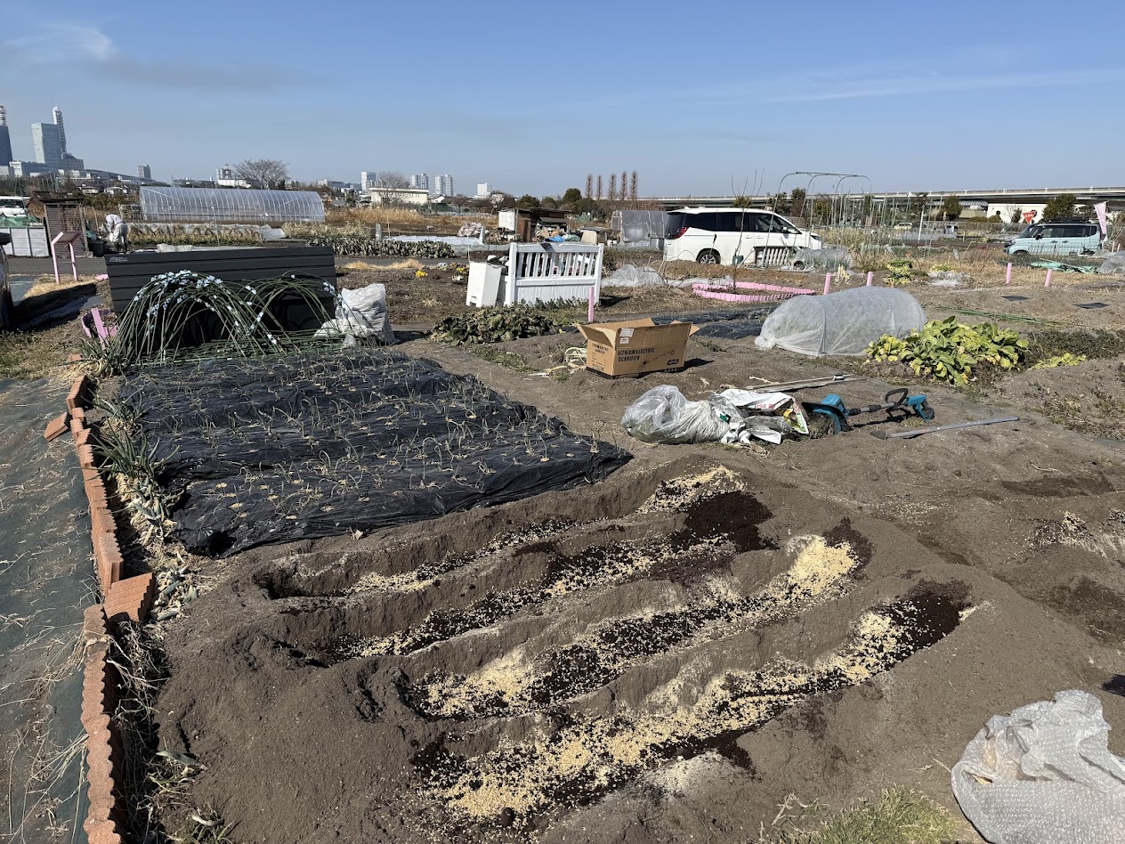 ジャガイモの豊作に向けて土づくりを始めました。